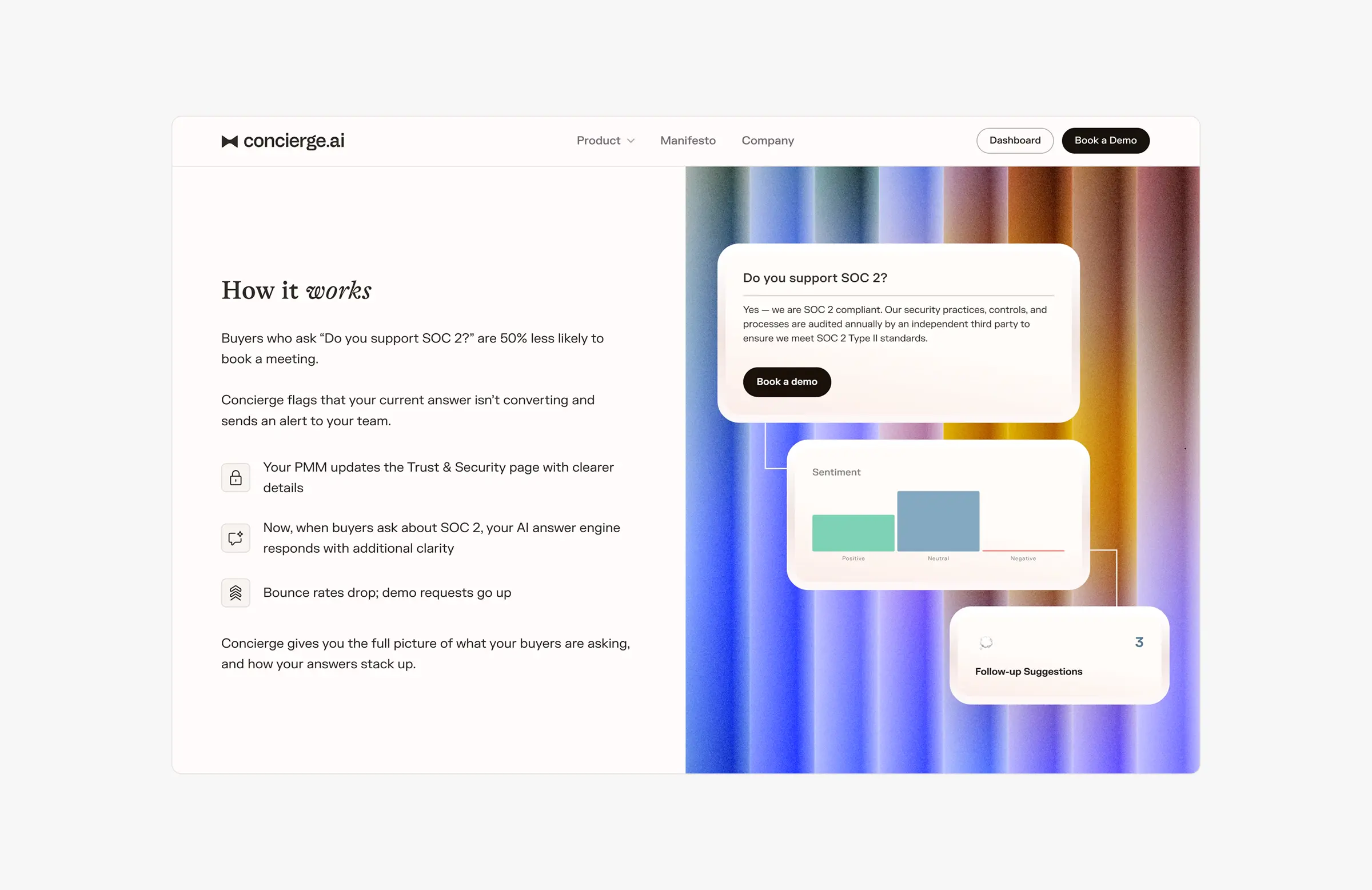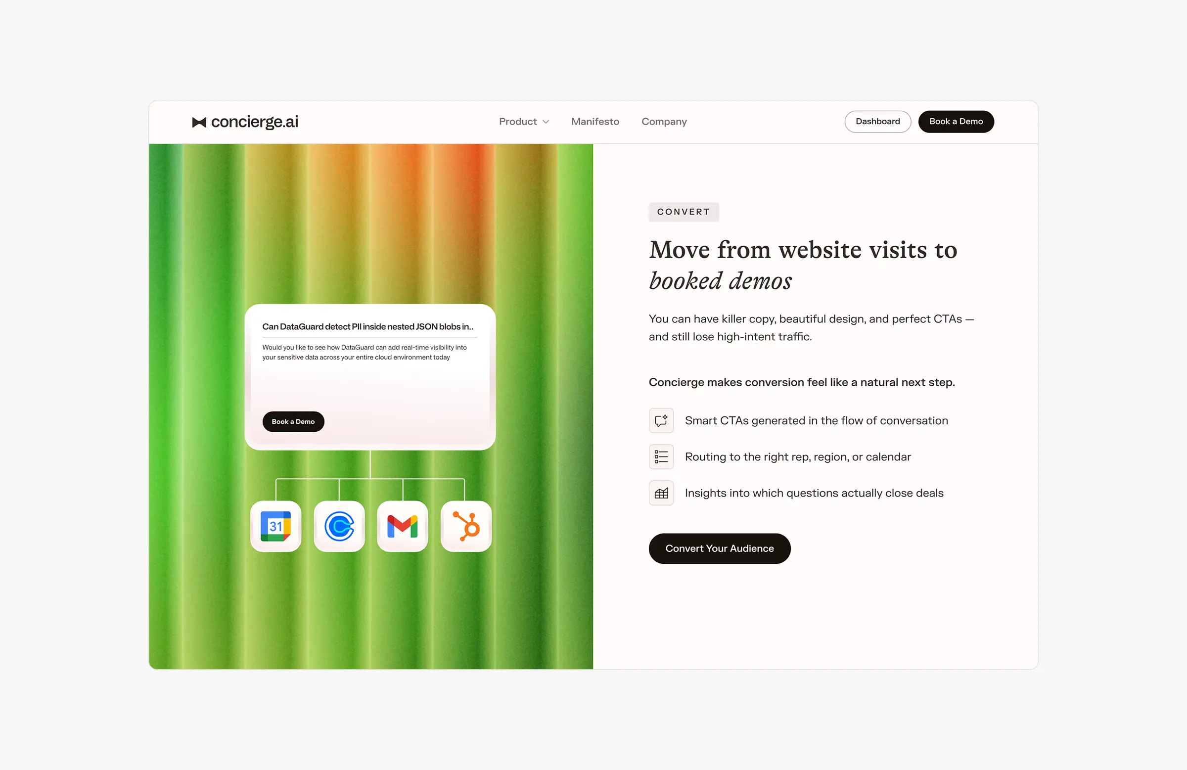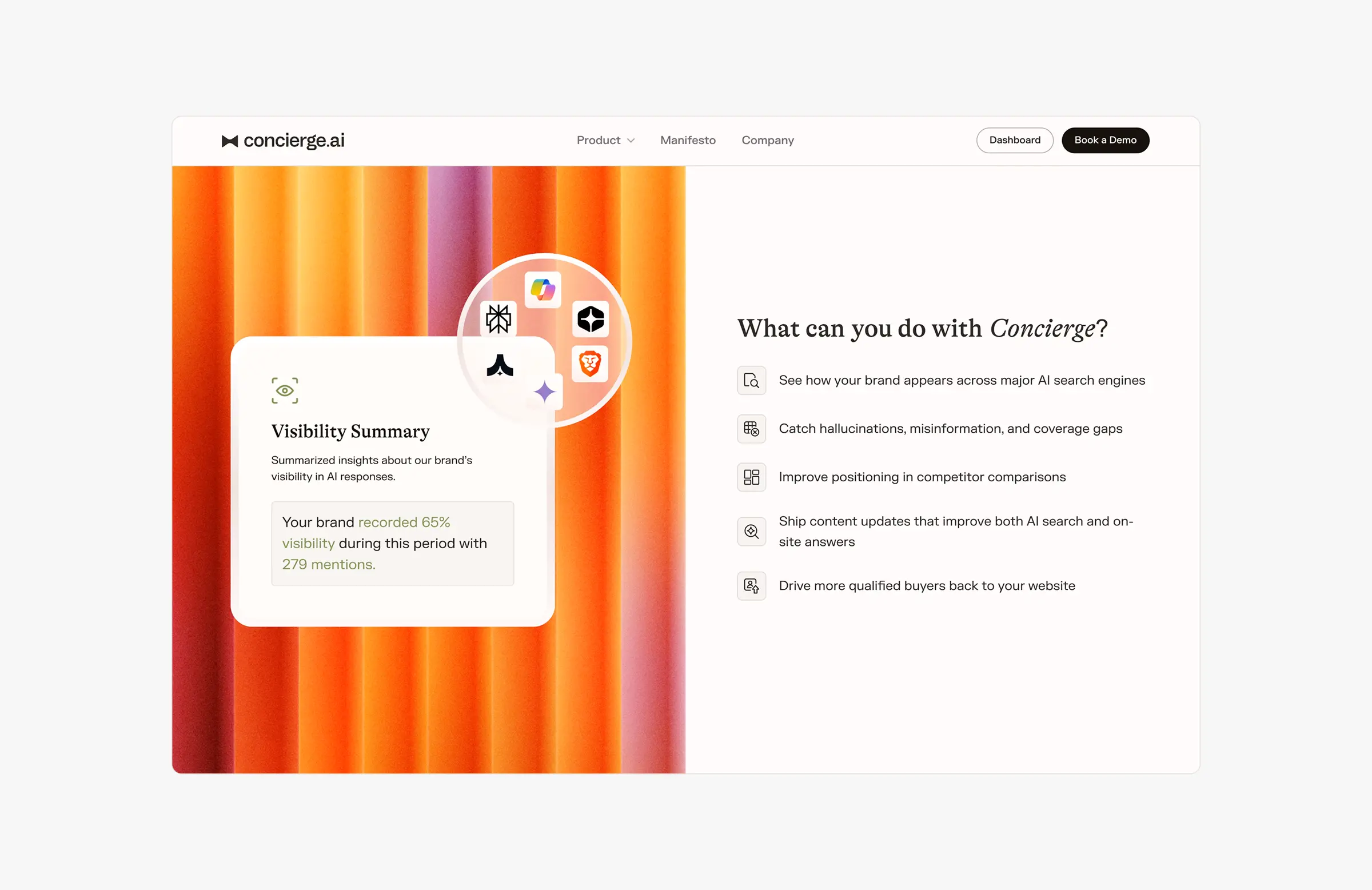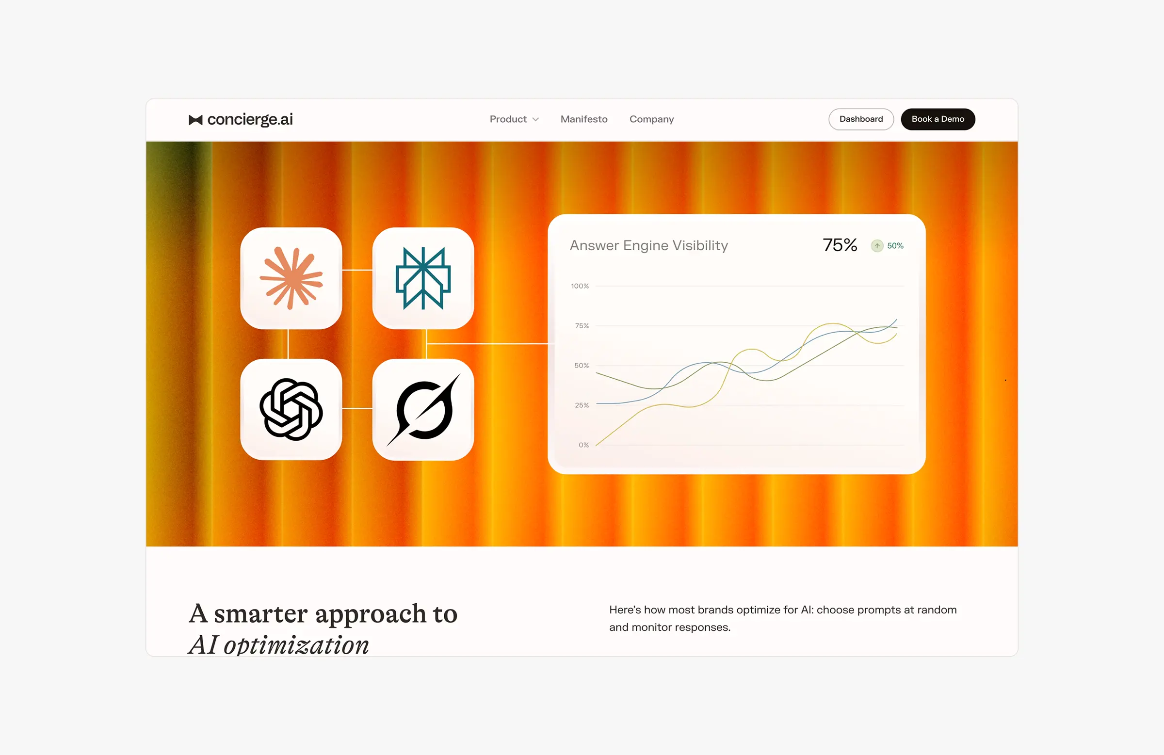 We designed and built Concierge’s Framer site to showcase an on-site AI sales assistant that answers buyer questions instantly, in your brand voice, using your product knowledge and content. The experience highlights how Concierge engages visitors 24/7, guides them to the right solutions, and captures higher-intent leads through smarter, self-serve conversations.
